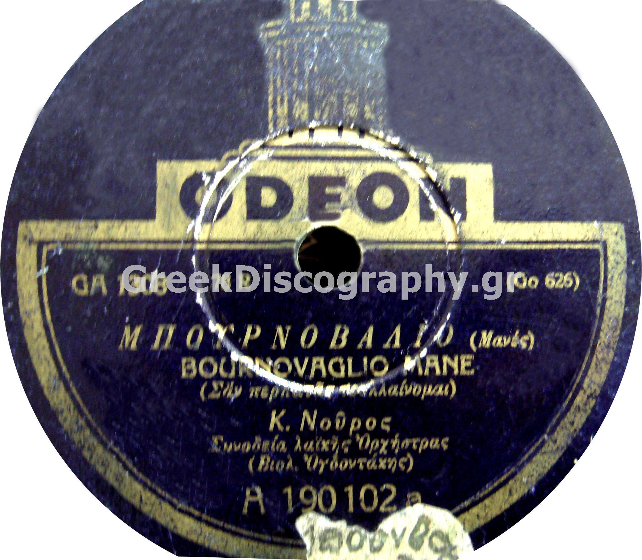 – «Μπουρνοβαλιό», Κώστας Νούρος και Λαϊκή Ορχήστρα με τον Ογδοντάκη (Γιάννη Δραγάτσης) στο βιολί, Αθήνα, 1928 (Odeon Go 626 – GA 1308 / A 190102 a).
