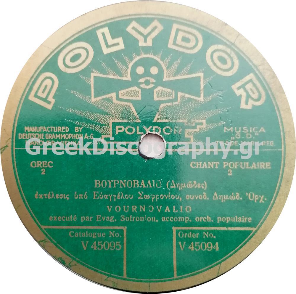 – «Βουρνοβαλιό», Βαγγέλης Σωφρονίου και Δημώδης Ορχήστρα, Αθήνα, 1926 (Polydor 4555 AR – V-45095).