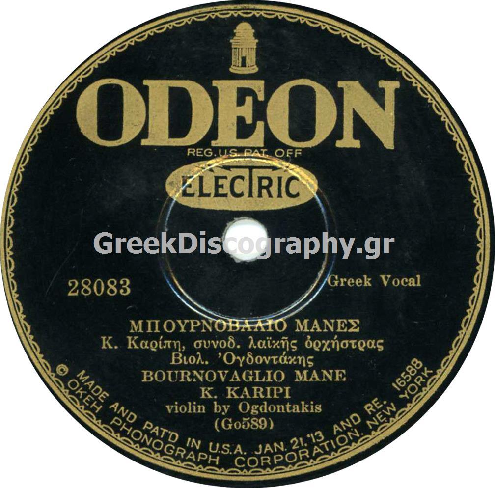– «Μπουρνοβαλιό μανές», Κώστας Καρίπης – Λαϊκή Ορχήστρα, με τον Ογδοντάκη (Γιάννη Δραγάτσης) στο βιολί, Αθήνα, 1928 (Odeon GO-589 – GA-1268 / A 190131 b και ανατυπώσεις Columbia USA G-7057-F, Odeon USA 28083).