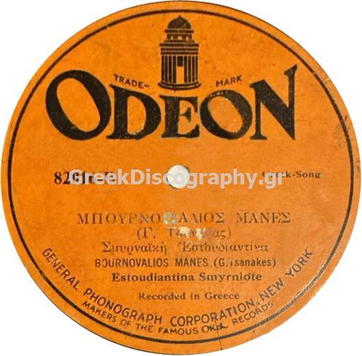 – «Βουρνοβαλιός μανές», Γ. Τσανάκας – Εστουδιαντίνα Σμυρναϊκή, πιθανώς Θεσσαλονίκη, 1909 (Odeon XSC-67 – 54733, παρούσα ηχογράφηση, και Odeon USA 82016-B).